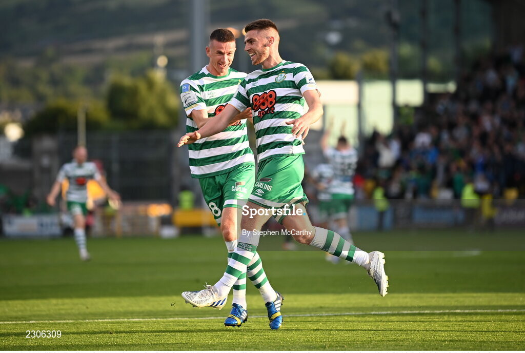 4 August 2022; Dylan Watts of Shamrock Rovers celebrates with team-mate Ronan Finn, left, after scoring his side's second goal during the UEFA Europa League third qualifying round first leg match between Shamrock Rovers and Shkupi at Tallaght Stadium in Dublin. Photo by Stephen McCarthy/Sportsfile