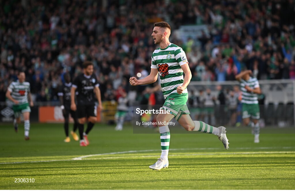 4 August 2022; Dylan Watts of Shamrock Rovers celebrates after scoring his side's second goal during the UEFA Europa League third qualifying round first leg match between Shamrock Rovers and Shkupi at Tallaght Stadium in Dublin. Photo by Stephen McCarthy/Sportsfile