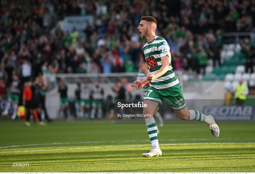 4 August 2022; Dylan Watts of Shamrock Rovers celebrates after scoring his side's second goal during the UEFA Europa League third qualifying round first leg match between Shamrock Rovers and Shkupi at Tallaght Stadium in Dublin. Photo by Stephen McCarthy/Sportsfile