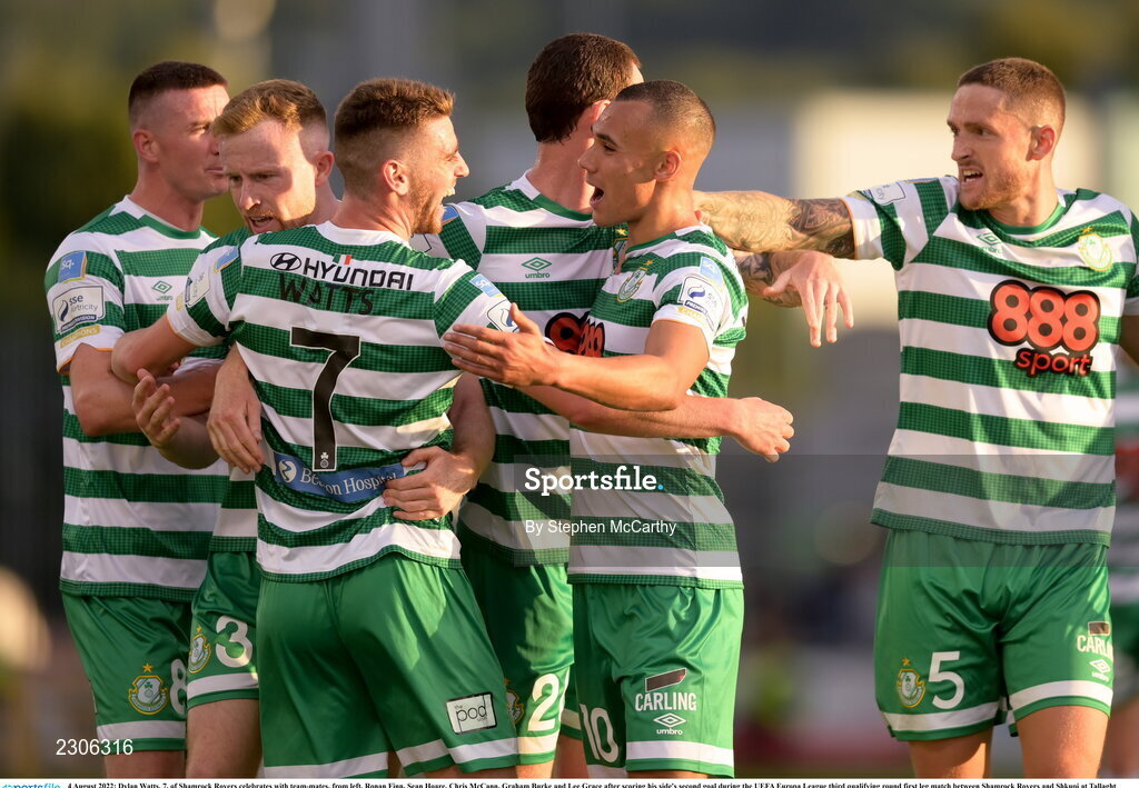 4 August 2022; Dylan Watts, 7, of Shamrock Rovers celebrates with team-mates, from left, Ronan Finn, Sean Hoare, Chris McCann, Graham Burke and Lee Grace after scoring his side's second goal during the UEFA Europa League third qualifying round first leg match between Shamrock Rovers and Shkupi at Tallaght Stadium in Dublin. Photo by Stephen McCarthy/Sportsfile