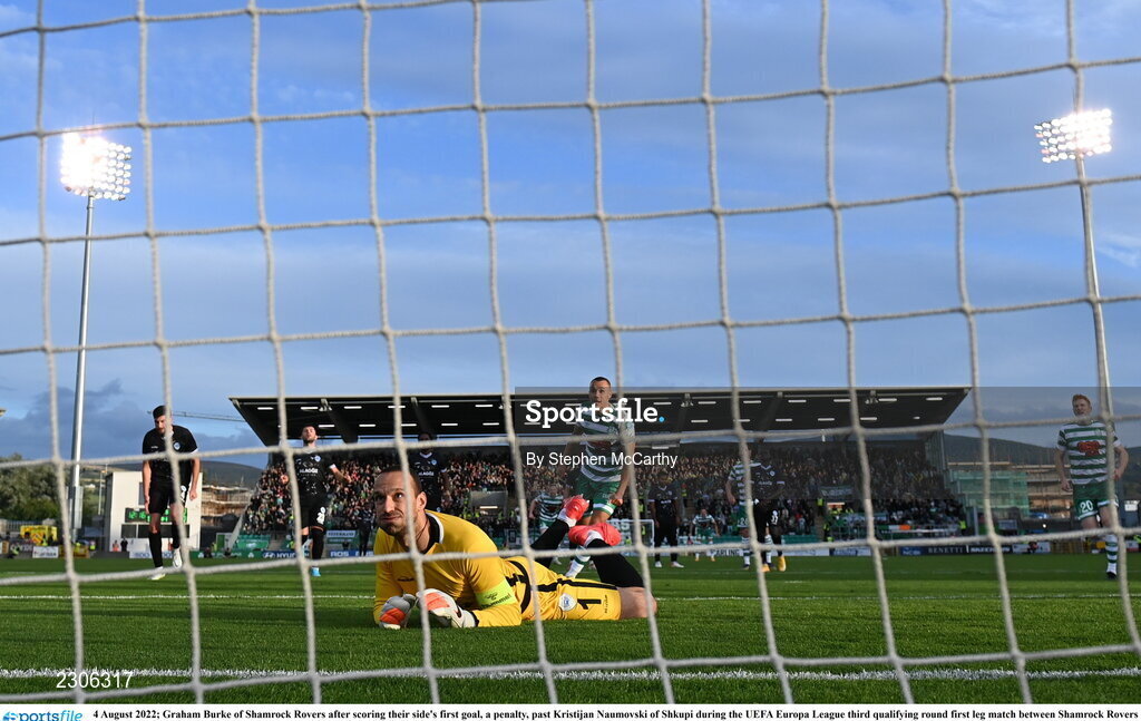 4 August 2022; Graham Burke of Shamrock Rovers after scoring their side's first goal, a penalty, past Kristijan Naumovski of Shkupi during the UEFA Europa League third qualifying round first leg match between Shamrock Rovers and Shkupi at Tallaght Stadium in Dublin. Photo by Stephen McCarthy/Sportsfile