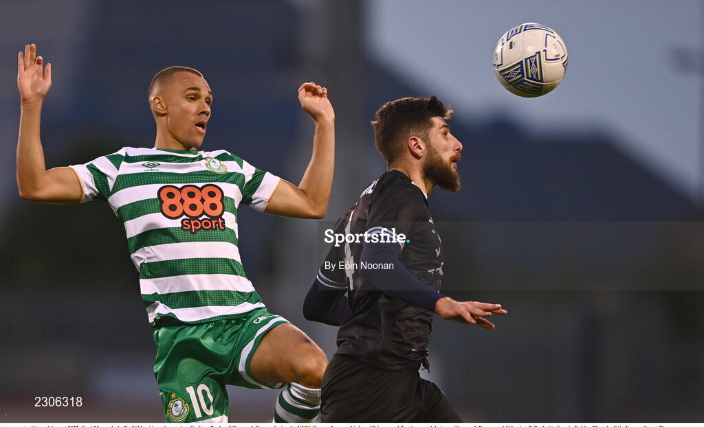 4 August 2022; Gagi Margvelashvili of Shkupi in action against Graham Burke of Shamrock Rovers during the UEFA Europa League third qualifying round first leg match between Shamrock Rovers and Shkupi at Tallaght Stadium in Dublin. Photo by Eóin Noonan/Sportsfile
