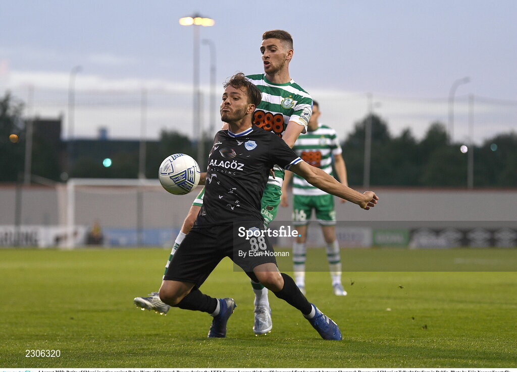 4 August 2022; Putita of Shkupi in action against Dylan Watts of Shamrock Rovers during the UEFA Europa League third qualifying round first leg match between Shamrock Rovers and Shkupi at Tallaght Stadium in Dublin. Photo by Eóin Noonan/Sportsfile