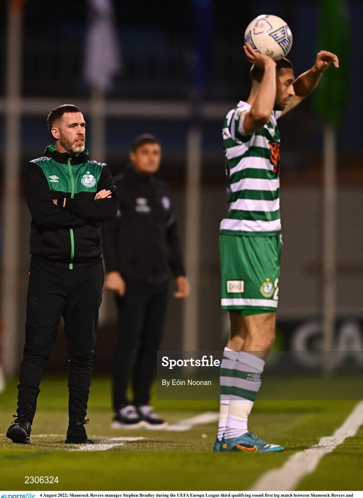 4 August 2022; Shamrock Rovers manager Stephen Bradley during the UEFA Europa League third qualifying round first leg match between Shamrock Rovers and Shkupi at Tallaght Stadium in Dublin. Photo by Eóin Noonan/Sportsfile