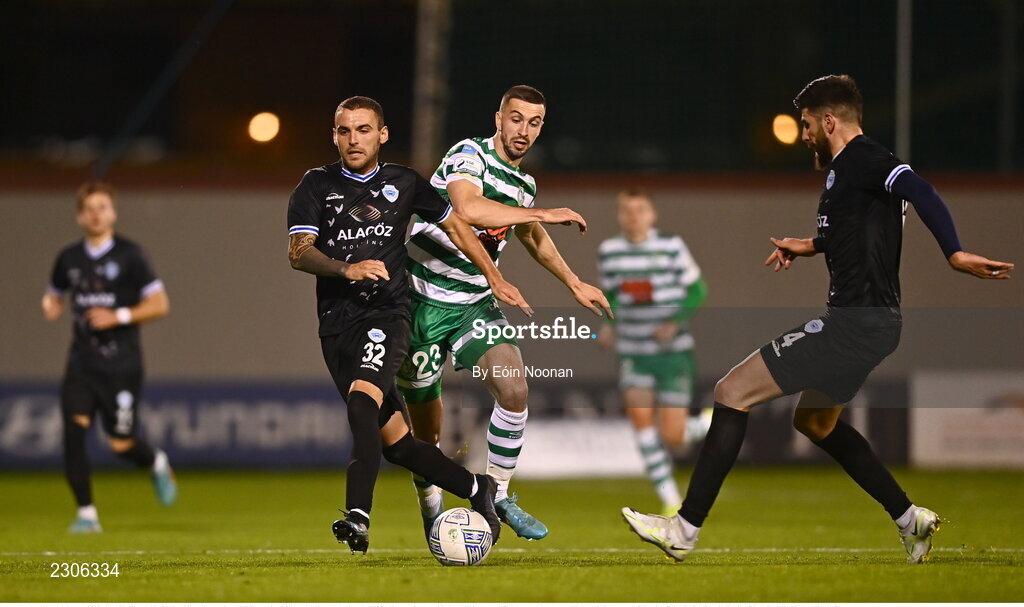 4 August 2022; Angelce Timovski of Shkupi in action against Neil Farrugia of Shamrock Rovers during the UEFA Europa League third qualifying round first leg match between Shamrock Rovers and Shkupi at Tallaght Stadium in Dublin. Photo by Eóin Noonan/Sportsfile