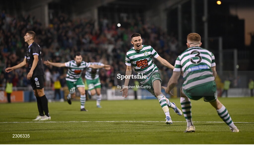 4 August 2022; Gary O'Neill of Shamrock Rovers, centre, celebrates after scoring his side's third goal during the UEFA Europa League third qualifying round first leg match between Shamrock Rovers and Shkupi at Tallaght Stadium in Dublin. Photo by Stephen McCarthy/Sportsfile