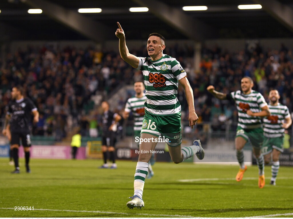 4 August 2022; Gary O'Neill of Shamrock Rovers celebrates after scoring his side's third goal during the UEFA Europa League third qualifying round first leg match between Shamrock Rovers and Shkupi at Tallaght Stadium in Dublin. Photo by Eóin Noonan/Sportsfile