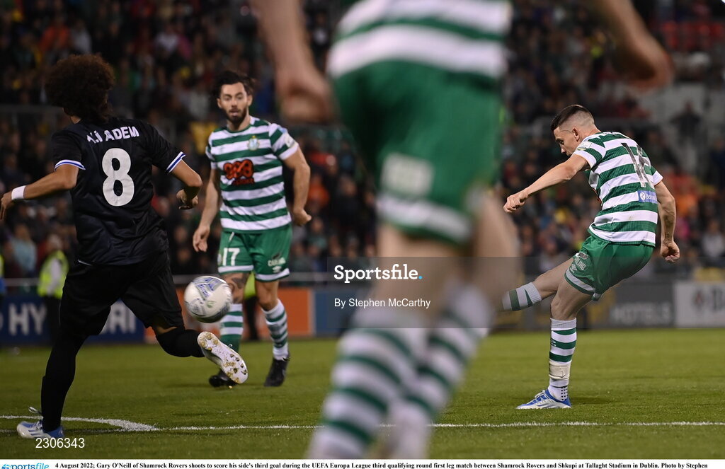 4 August 2022; Gary O'Neill of Shamrock Rovers shoots to score his side's third goal during the UEFA Europa League third qualifying round first leg match between Shamrock Rovers and Shkupi at Tallaght Stadium in Dublin. Photo by Stephen McCarthy/Sportsfile
