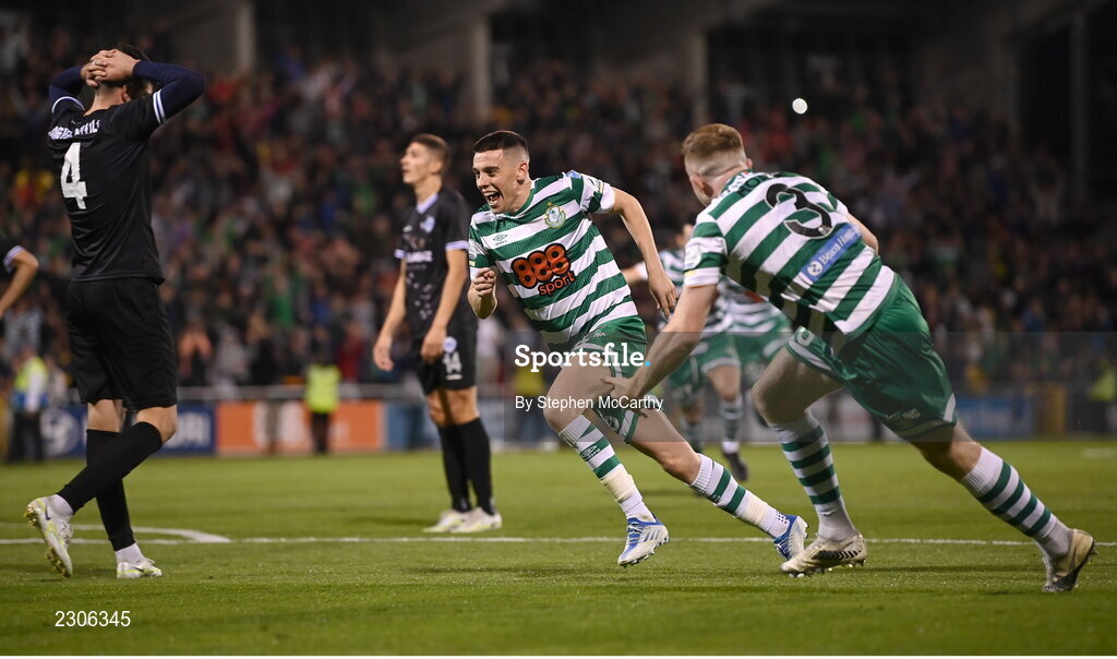4 August 2022; Gary O'Neill of Shamrock Rovers celebrates after scoring his side's third goal during the UEFA Europa League third qualifying round first leg match between Shamrock Rovers and Shkupi at Tallaght Stadium in Dublin. Photo by Stephen McCarthy/Sportsfile