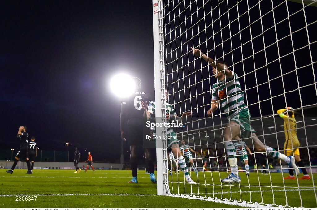 4 August 2022; Gary O'Neill of Shamrock Rovers, left, celebrates after scoring his side's third goal during the UEFA Europa League third qualifying round first leg match between Shamrock Rovers and Shkupi at Tallaght Stadium in Dublin. Photo by Eóin Noonan/Sportsfile