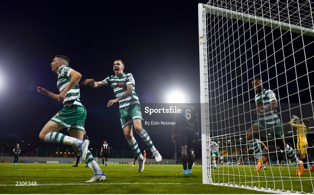 4 August 2022; Gary O'Neill of Shamrock Rovers, left, celebrates after scoring his side's third goal during the UEFA Europa League third qualifying round first leg match between Shamrock Rovers and Shkupi at Tallaght Stadium in Dublin. Photo by Eóin Noonan/Sportsfile