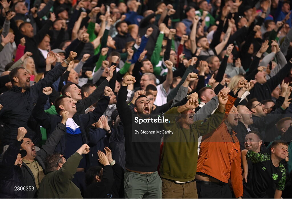 4 August 2022; Shamrock Rovers supporters celebrate their third goal during the UEFA Europa League third qualifying round first leg match between Shamrock Rovers and Shkupi at Tallaght Stadium in Dublin. Photo by Stephen McCarthy/Sportsfile