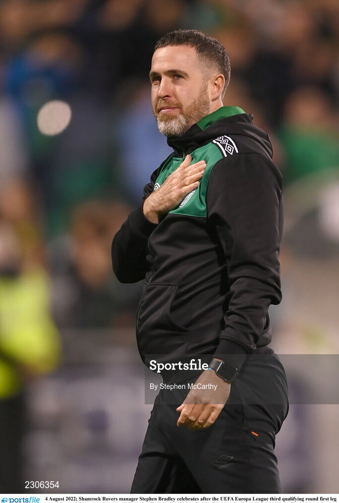 4 August 2022; Shamrock Rovers manager Stephen Bradley celebrates after the UEFA Europa League third qualifying round first leg match between Shamrock Rovers and Shkupi at Tallaght Stadium in Dublin. Photo by Stephen McCarthy/Sportsfile