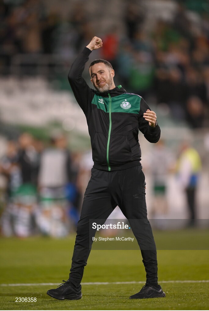 4 August 2022; Shamrock Rovers manager Stephen Bradley celebrates after the UEFA Europa League third qualifying round first leg match between Shamrock Rovers and Shkupi at Tallaght Stadium in Dublin. Photo by Stephen McCarthy/Sportsfile