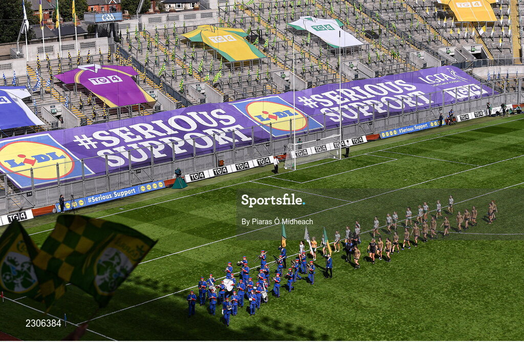 31 July 2022; Both teams march in the pre-match parade behind the Artane Band before the TG4 All-Ireland Ladies Football Senior Championship Final match between Kerry and Meath at Croke Park in Dublin. Photo by Piaras Ó Mídheach/Sportsfile