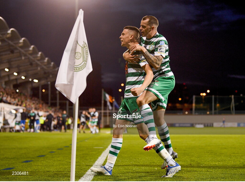 4 August 2022; Gary O'Neill of Shamrock Rovers celebrates with teammate Sean Kavanagh after scoring his side's third goal during the UEFA Europa League third qualifying round first leg match between Shamrock Rovers and Shkupi at Tallaght Stadium in Dublin. Photo by Eóin Noonan/Sportsfile