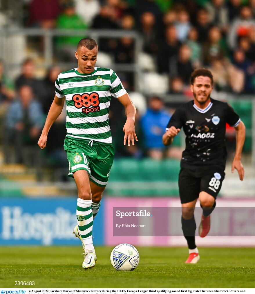 4 August 2022; Graham Burke of Shamrock Rovers during the UEFA Europa League third qualifying round first leg match between Shamrock Rovers and Shkupi at Tallaght Stadium in Dublin. Photo by Eóin Noonan/Sportsfile