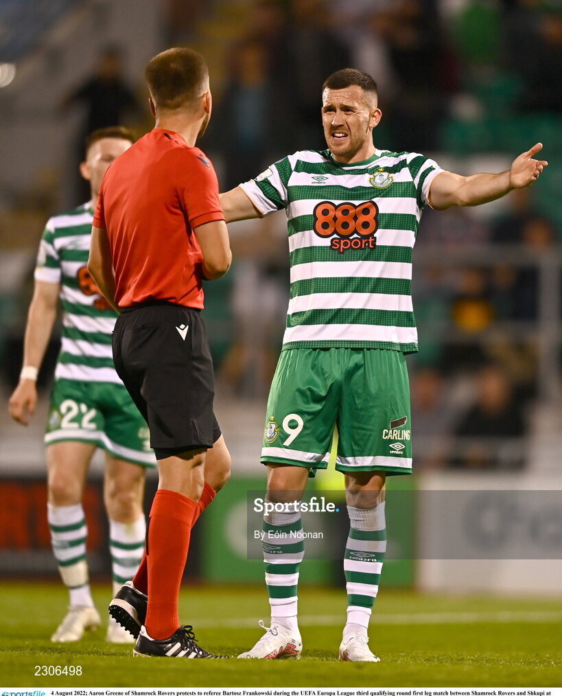 4 August 2022; Aaron Greene of Shamrock Rovers protests to referee Bartosz Frankowski during the UEFA Europa League third qualifying round first leg match between Shamrock Rovers and Shkupi at Tallaght Stadium in Dublin. Photo by Eóin Noonan/Sportsfile