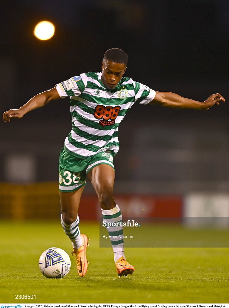 4 August 2022; Aidomo Emakhu of Shamrock Rovers during the UEFA Europa League third qualifying round first leg match between Shamrock Rovers and Shkupi at Tallaght Stadium in Dublin. Photo by Eóin Noonan/Sportsfile