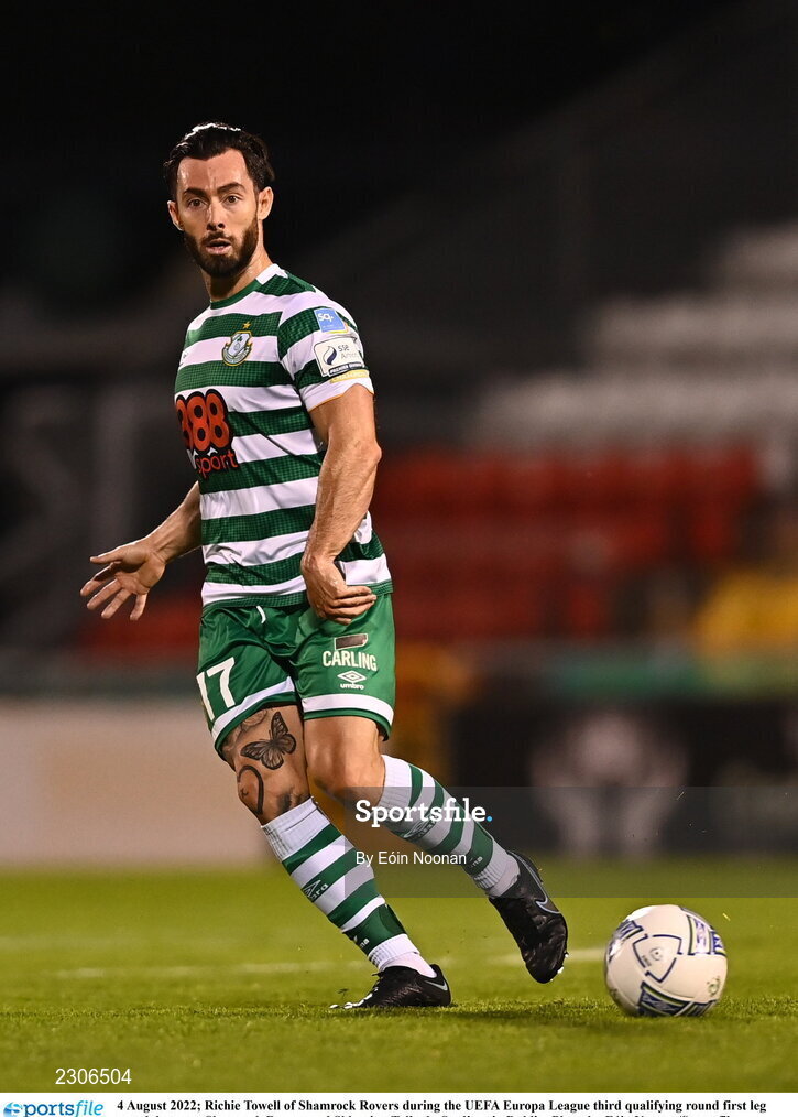4 August 2022; Richie Towell of Shamrock Rovers during the UEFA Europa League third qualifying round first leg match between Shamrock Rovers and Shkupi at Tallaght Stadium in Dublin. Photo by Eóin Noonan/Sportsfile