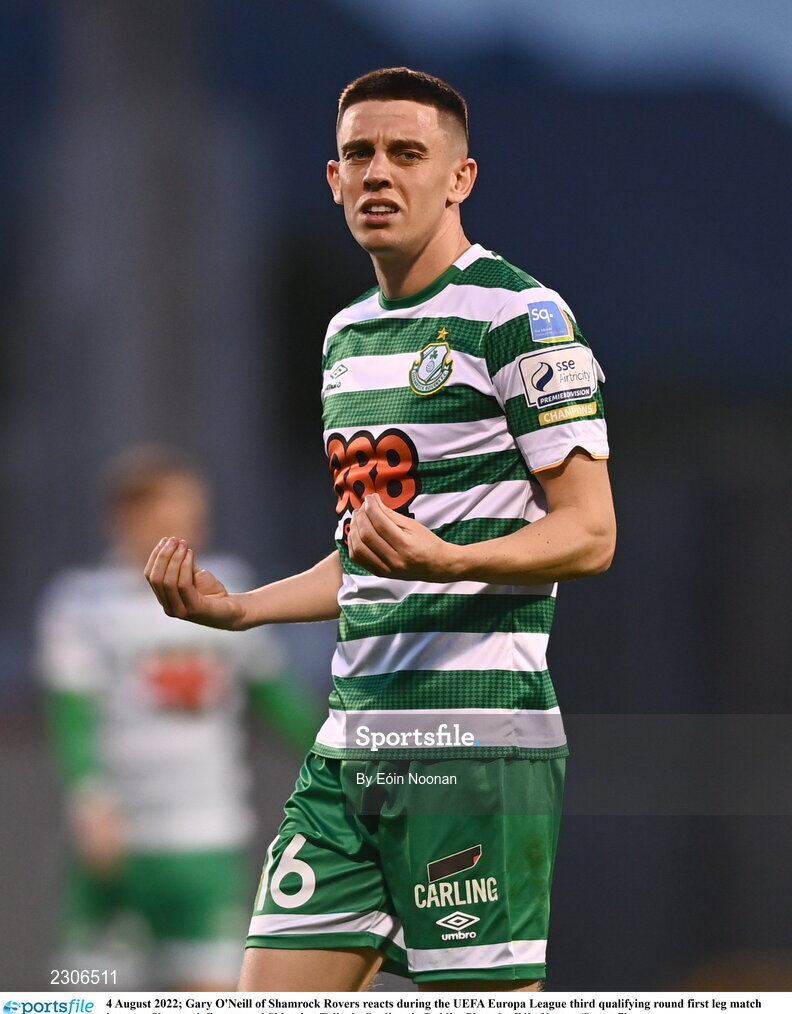 4 August 2022; Gary O'Neill of Shamrock Rovers reacts during the UEFA Europa League third qualifying round first leg match between Shamrock Rovers and Shkupi at Tallaght Stadium in Dublin. Photo by Eóin Noonan/Sportsfile