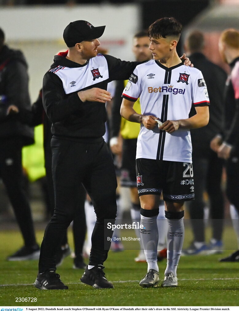 5 August 2022; Dundalk head coach Stephen O'Donnell with Ryan O'Kane of Dundalk after their side's draw in the SSE Airtricity League Premier Division match between Dundalk and Derry City at Oriel Park in Dundalk, Louth. Photo by Ben McShane/Sportsfile