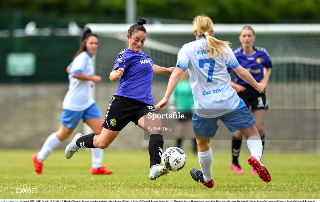 6 August 2022; Nikki Dunphy of Wexford & District Women's League in action against Louise Gleeson of Eastern Women's Football League during the FAI Women's Angela Hearst InterLeague Cup Final match between Wexford & District Women's League and Eastern Women's Football League at Arklow Town FC, in Wicklow. Photo by Seb Daly/Sportsfile