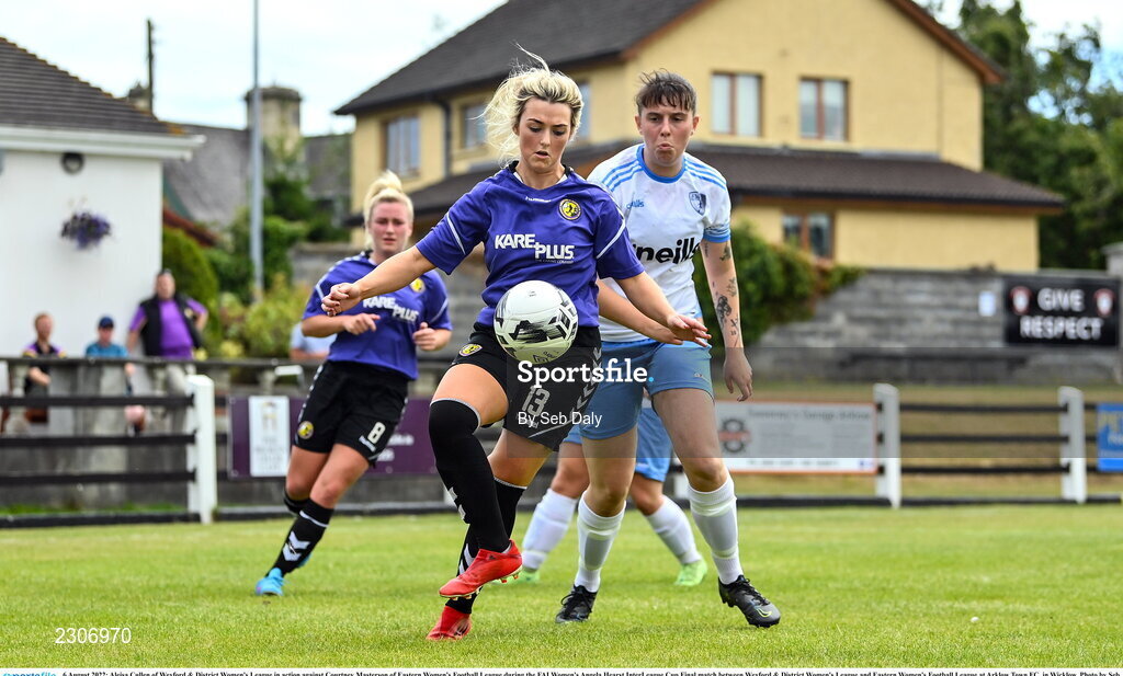 6 August 2022; Aleisha Cullen of Wexford & District Women's League in action against Courtney Masterson of Eastern Women's Football League during the FAI Women's Angela Hearst InterLeague Cup Final match between Wexford & District Women's League and Eastern Women's Football League at Arklow Town FC, in Wicklow. Photo by Seb Daly/Sportsfile