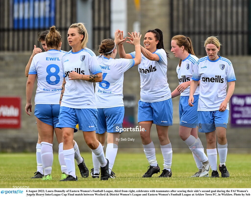 6 August 2022; Laura Donnelly of Eastern Women's Football League, third from right, celebrates with teammates after scoring their side's second goal during the FAI Women's Angela Hearst InterLeague Cup Final match between Wexford & District Women's League and Eastern Women's Football League at Arklow Town FC, in Wicklow. Photo by Seb Daly/Sportsfile