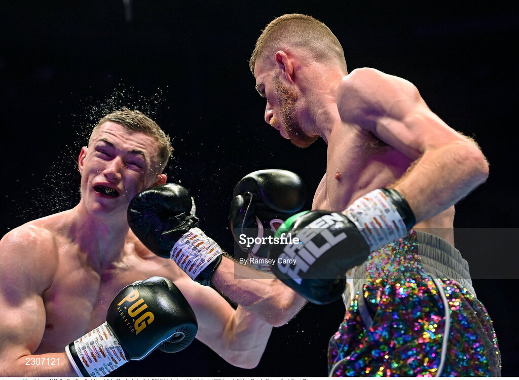 6 August 2022; Ruadhan Farrell, right, and Colm Murphy during their BUI Celtic featherweight title bout at SSE Arena in Belfast. Photo by Ramsey Cardy/Sportsfile