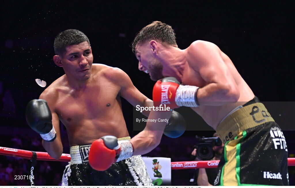 6 August 2022; Sean McComb, right, knocks out the gumshield of Ramiro Blanco during their super-lightweight bout at SSE Arena in Belfast. Photo by Ramsey Cardy/Sportsfile