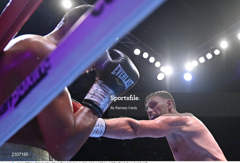 6 August 2022; Sean McComb, right, and Ramiro Blanco during their super-lightweight bout at SSE Arena in Belfast. Photo by Ramsey Cardy/Sportsfile