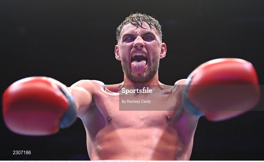 6 August 2022; Sean McComb celebrates defeating Ramiro Blanco during their super-lightweight bout at SSE Arena in Belfast. Photo by Ramsey Cardy/Sportsfile
