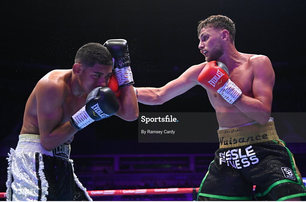 6 August 2022; Sean McComb, right, and Ramiro Blanco during their super-lightweight bout at SSE Arena in Belfast. Photo by Ramsey Cardy/Sportsfile
