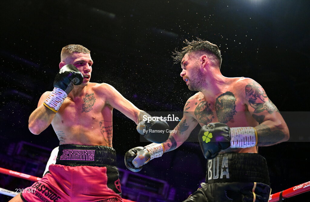 6 August 2022; Tyrone McKenna, right, and Chris Jenkins during their welterweight bout at SSE Arena in Belfast. Photo by Ramsey Cardy/Sportsfile