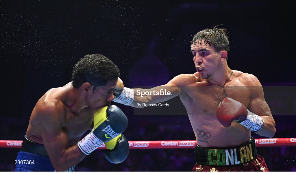 6 August 2022; Michael Conlan, right, and Miguel Marriaga during their featherweight bout at SSE Arena in Belfast. Photo by Ramsey Cardy/Sportsfile