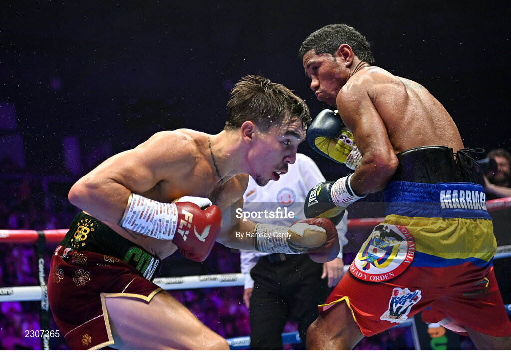 6 August 2022; Michael Conlan, left, and Miguel Marriaga during their featherweight bout at SSE Arena in Belfast. Photo by Ramsey Cardy/Sportsfile