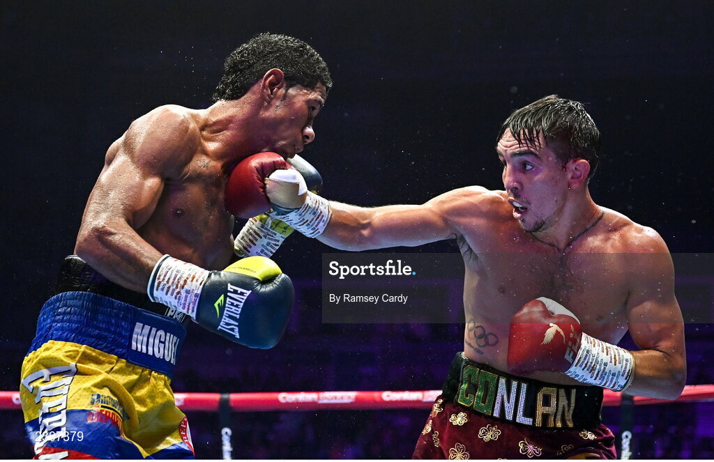 6 August 2022; Michael Conlan, right, and Miguel Marriaga during their featherweight bout at SSE Arena in Belfast. Photo by Ramsey Cardy/Sportsfile