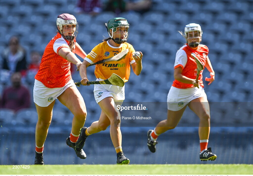 7 August 2022; Emma Laverty of Antrim in action against Tierna Maguire of Armagh during the Glen Dimplex All-Ireland Premier Junior Camogie Championship Final match between Antrim and Armagh at Croke Park in Dublin. Photo by Piaras Ó Mídheach/Sportsfile