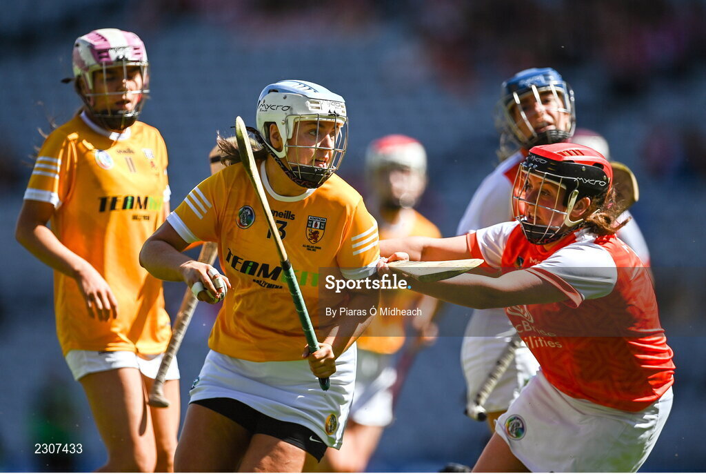 7 August 2022; Dervla Cosgrove of Antrim in action against Nicola Woods of Armagh during the Glen Dimplex All-Ireland Premier Junior Camogie Championship Final match between Antrim and Armagh at Croke Park in Dublin. Photo by Piaras Ó Mídheach/Sportsfile