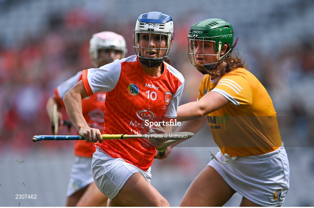 7 August 2022; Jennifer Curry of Armagh in action against Caitlin Crawford of Antrim during the Glen Dimplex All-Ireland Premier Junior Camogie Championship Final match between Antrim and Armagh at Croke Park in Dublin. Photo by Piaras Ó Mídheach/Sportsfile