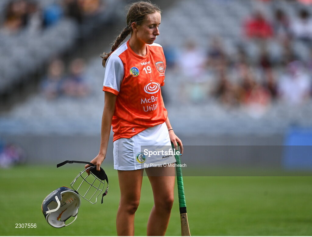 7 August 2022; Ellen Lavery of Armagh after her side's defeat in the Glen Dimplex All-Ireland Premier Junior Camogie Championship Final match between Antrim and Armagh at Croke Park in Dublin. Photo by Piaras Ó Mídheach/Sportsfile