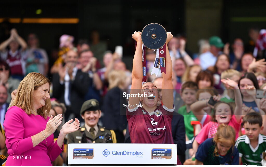 7 August 2022; Galway captain Lisa Casserly lifts the Jack McGrath Cup after her side's victory the Glen Dimplex All-Ireland Intermediate Camogie Championship Final match between Cork and Galway at Croke Park in Dublin. Photo by Seb Daly/Sportsfile