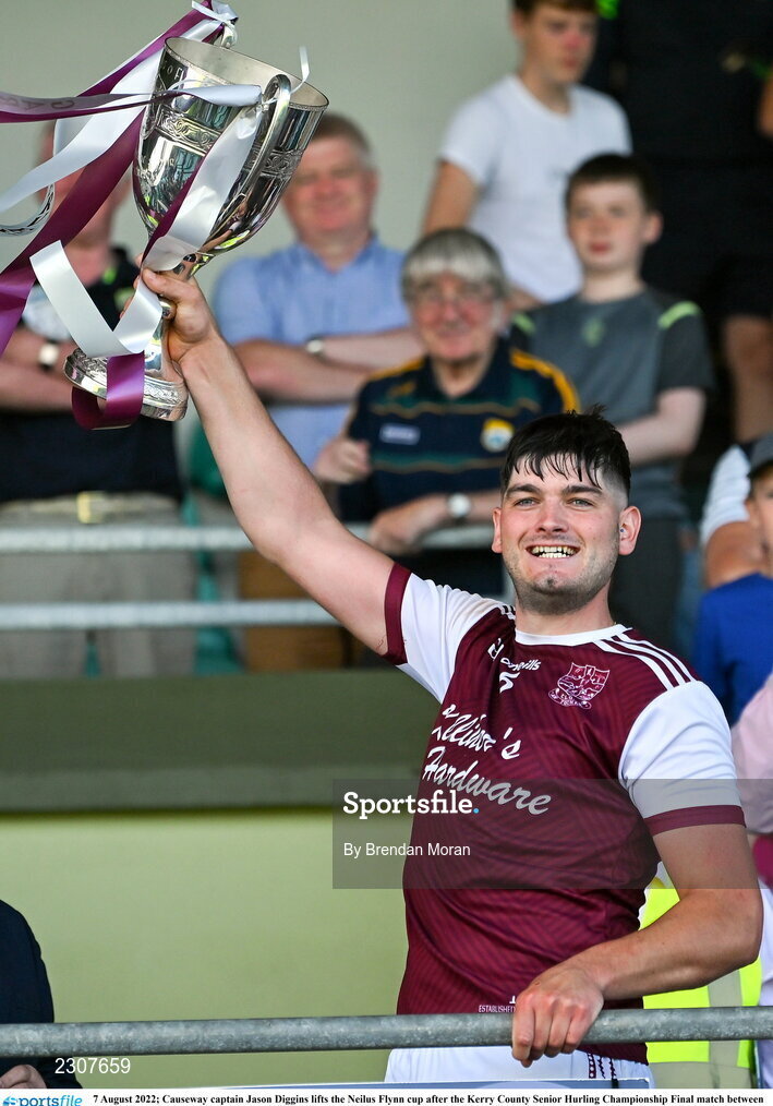 7 August 2022; Causeway captain Jason Diggins lifts the Neilus Flynn cup after the Kerry County Senior Hurling Championship Final match between Ballyduff and Causeway at Austin Stack Park in Tralee, Kerry. Photo by Brendan Moran/Sportsfile