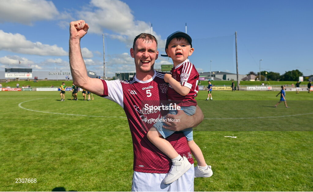 7 August 2022; Tommy Barrett of Causeway celebrates with his son Mason after the Kerry County Senior Hurling Championship Final match between Ballyduff and Causeway at Austin Stack Park in Tralee, Kerry. Photo by Brendan Moran/Sportsfile