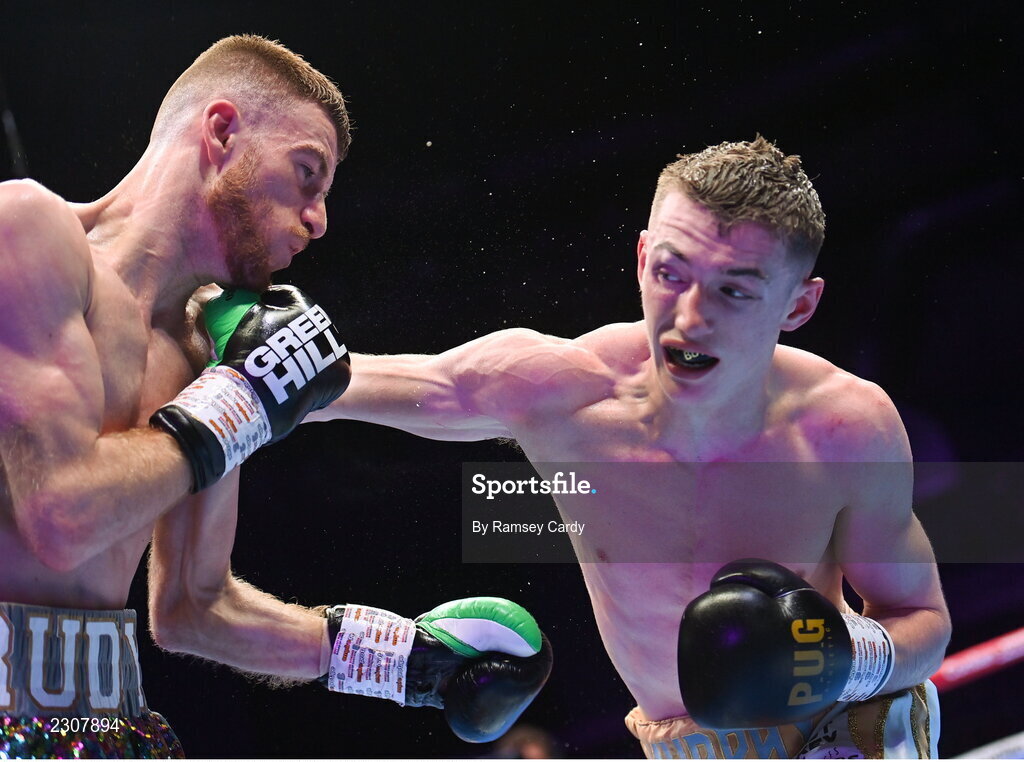 6 August 2022; Ruadhan Farrell, left, and Colm Murphy during their BUI Celtic featherweight title bout at SSE Arena in Belfast. Photo by Ramsey Cardy/Sportsfile