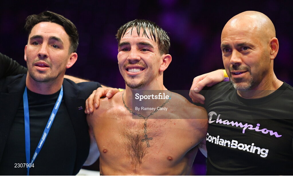 6 August 2022; Michael Conlan, centre, with his brother Jamie, left, and trainer Adam Booth, after his featherweight bout against Miguel Marriaga at SSE Arena in Belfast. Photo by Ramsey Cardy/Sportsfile