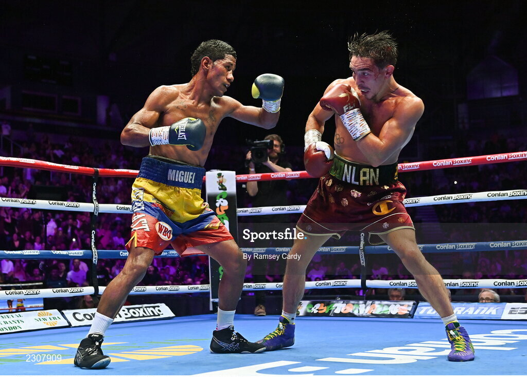 6 August 2022; Michael Conlan, right, and Miguel Marriaga during their featherweight bout at SSE Arena in Belfast. Photo by Ramsey Cardy/Sportsfile