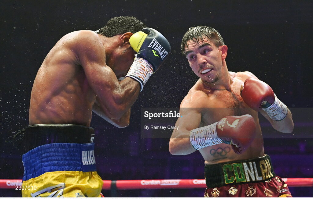 6 August 2022; Michael Conlan, right, and Miguel Marriaga during their featherweight bout at SSE Arena in Belfast. Photo by Ramsey Cardy/Sportsfile