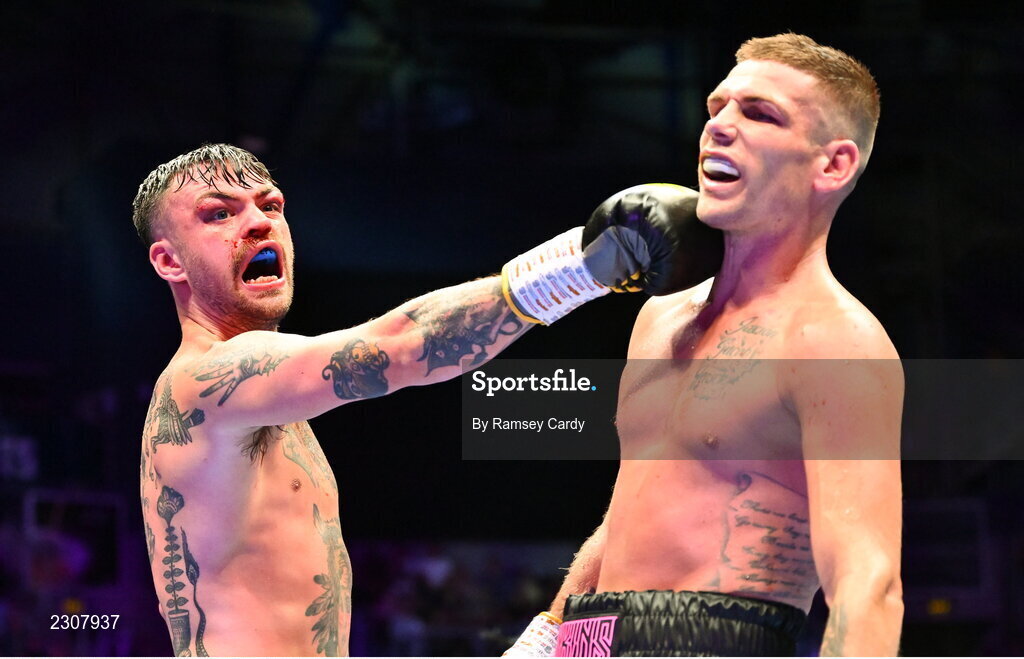 6 August 2022; Tyrone McKenna, left, and Chris Jenkins share a joke after their welterweight bout at SSE Arena in Belfast. Photo by Ramsey Cardy/Sportsfile